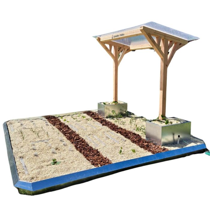 OPTION kit de mise en hivernage du potager : permet de recouvrir la surface du potager pendant l'hiver afin de limiter le développement des mauvaises herbes et de booster l’activité du sol. Fourni : toile sur-mesure en PLA (fibres biosourcées) et agrafes.